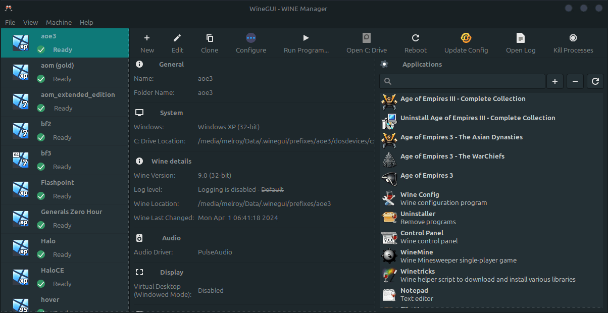 At last, a user-interface friendly Wine (A compatibility layer capable of running Windows applications under Linux) Manager.