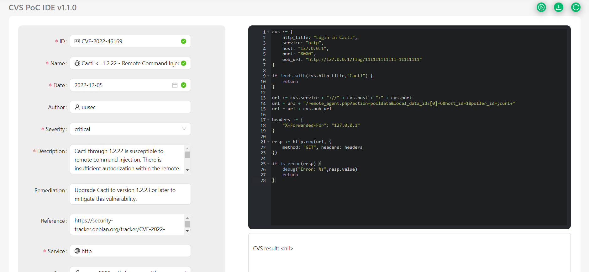上图右上角分别为运行、保存、刷新按钮,运行按钮用于调试PoC脚本,该脚本语法类似golang,图中 cvs结构体 在CVS扫描器中会自动根据target.json生成,无需实现,仅在调试时方便测试,自行声明。